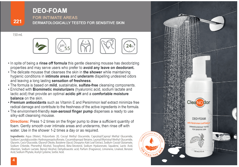• In spite of being a rinse off formula this gentle cleansing mousse has deodorizing properties and may serve users who prefer to avoid any leave on deodorant. • The delicate mousse that cleanses the skin in the shower while maintaining hygienic conditions in intimate areas and underarm dispelling undesired odors and leaving a long lasting sensation of freshness. • The formula is based on mild, sustainable, sulfate-free cleansing components. • Enriched with Biomimetic moisturizers (hyaluronic acid, sodium lactate and lactic acid) that provide an optimal acidic pH and a comfortable moisture balance on the skin. • Premium antioxidants such as Vitamin E and Persimmon leaf extract minimize free radical damage and contribute to the freshness of the active ingredients in the formula. • The environment-friendly non-aerosol finger pump dispenses a ready to use silky-soft cleansing mousse